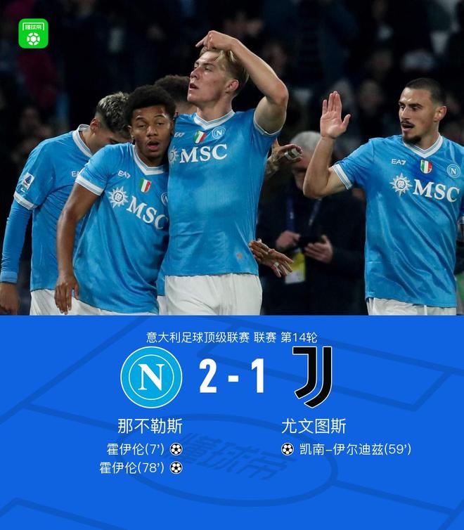 北京时间12月8日,意大利足球顶级联赛第14轮展开较量,那不勒斯坐镇主场迎战尤文图斯。上半场,内雷斯助攻霍伊伦包抄破门,麦克托米奈头球攻门中柱;下半场,麦肯尼助攻伊尔迪兹推射入网扳平,麦肯尼乌龙助攻霍伊伦上演梅开二度。最终,那不勒斯以2比1战胜尤文图斯,全取三分。
